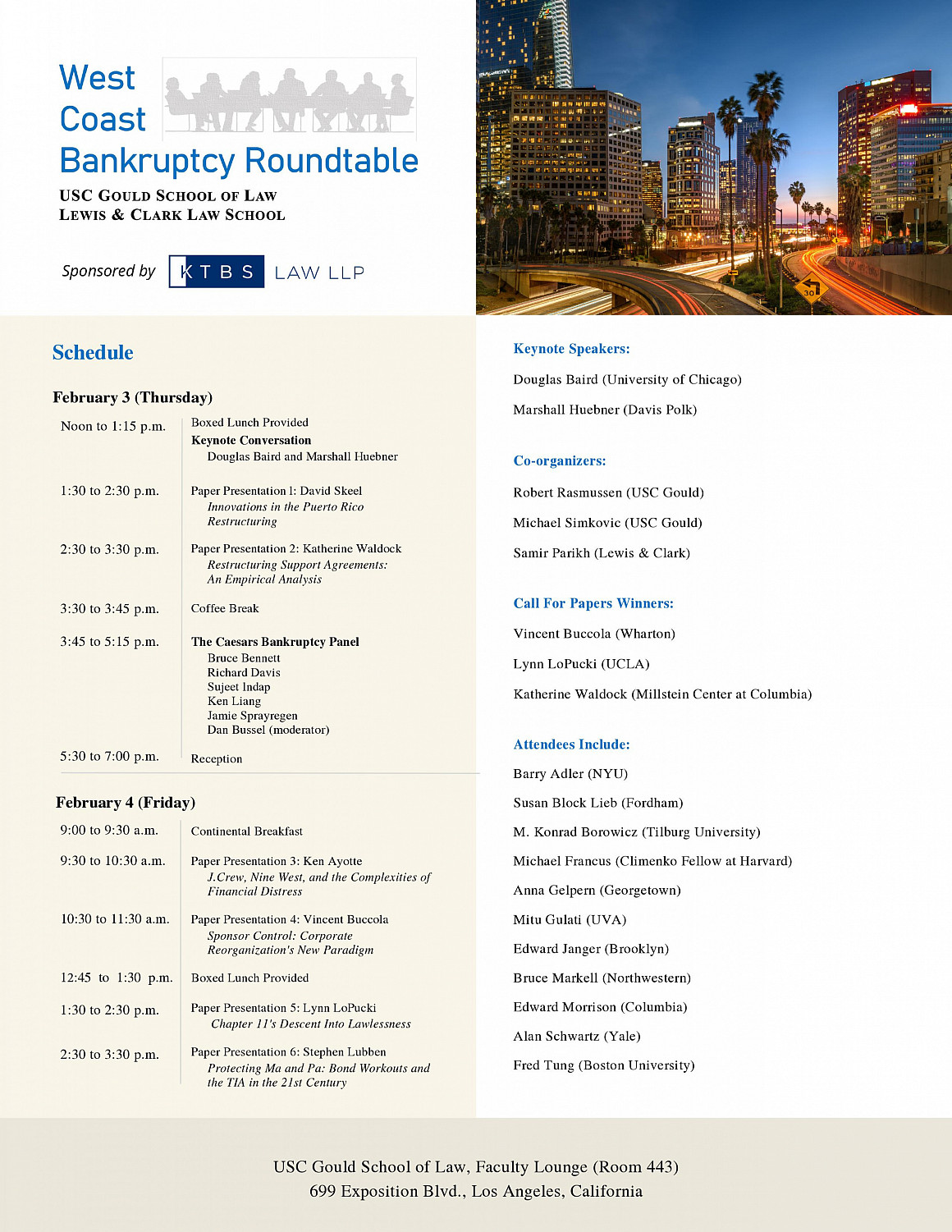 USC Gould School of Law and Lewis & Clark Law School have partnered to host the West Coast Bankruptcy Roundtable, scheduled for February 3-4, 2022, in Los Angeles. Spearheaded by Robert Rasmussen, Michael Simkovic, and Samir Parikh, the Roundtable seeks to bring together experienced and junior scholars to discuss particularly noteworthy scholarship involving financial restructuring and business law.