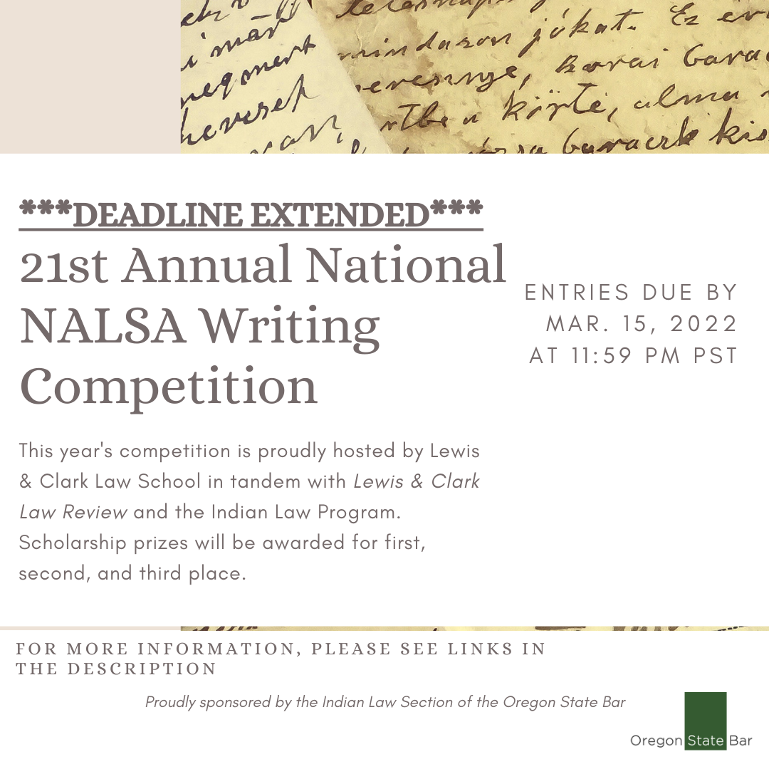 Lewis & Clark Law School, in partnership with the Lewis & Clark Law Review and the Indian Law Program, and with financial support from the Indian Law Section of the Oregon State Bar, is hosting the national writing competition, “The 21st Annual National Native American Law Student Association Writing Competition”.