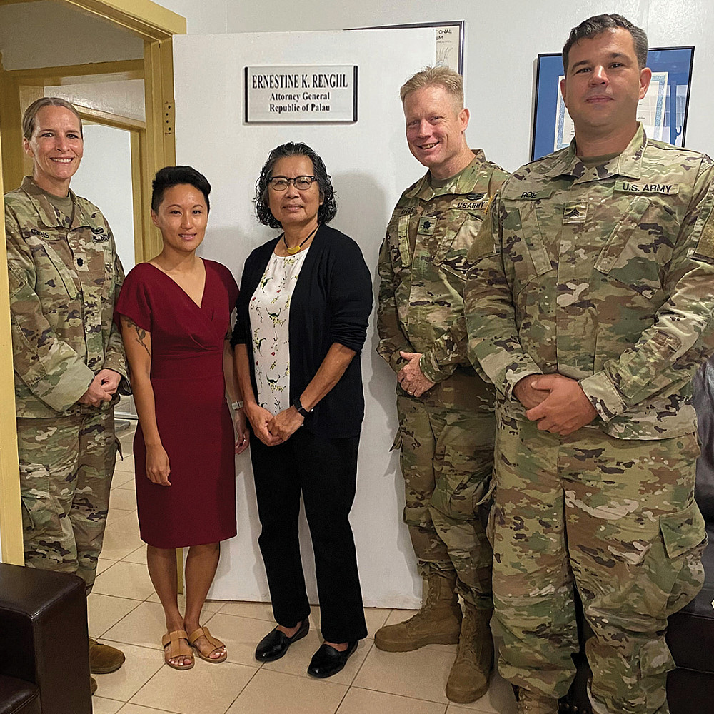Ed Riffle ’97 (second from right) connects with fellow alum, Palau’s Attorney General Ernestine Kawai Regiil ’84 (center), during his Army Reserve deployment to Palau.