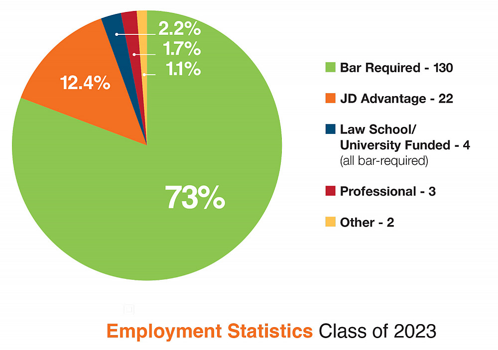 Equally impressive, 85% of those employed are in bar-required or JD-advantage positions, and an additional 2.2% in bar-required fellowships and clinic positions, which are classified as law school funded.