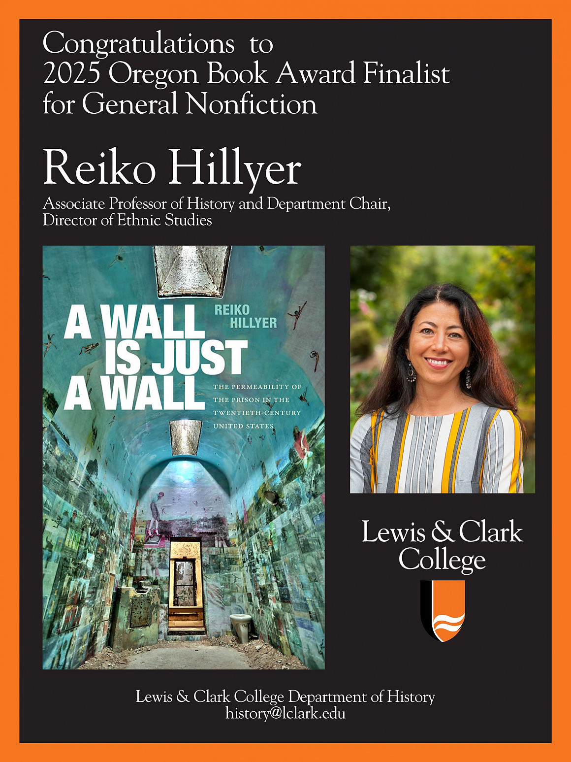 Congratulations to Reiko Hillyer whose book A WALL IS JUST A WALL: THE PERMEABILITY OF THE PRISON IN THE TWENTIETH-CENTURY UNITED STATES (Duke University Press, 2024) is a finalist for the 2025 Oregon Book Awards in the category of General Nonfiction.