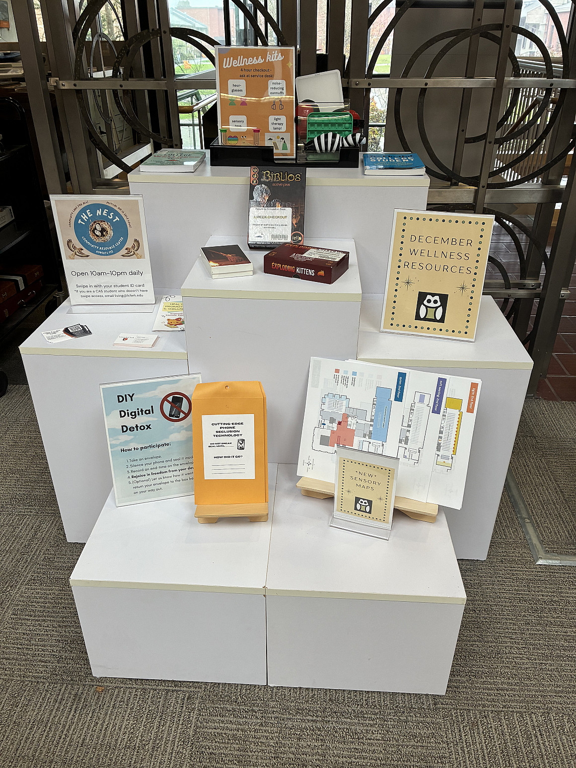 This month Watzek is featuring resources available in the library and on campus in support of stress reduction, health, and wellbeing. Peruse the new sensory maps, which provide guidance on selecting study spaces based on light, quiet, and soft seating. View the contents of library wellness kits, which are available to check out for 4 hours at the service desk. Take a digital detox with cutting edge phone seclusion technology. And more!