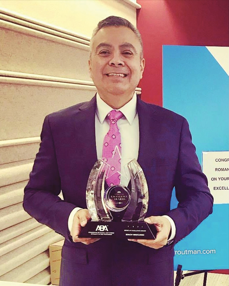 Román D. Hernández ’00 received the American Bar Association (ABA) “Spirit of Excellence” award from the ABA Commission on Racial and Ethnic Diversity in the Profession.