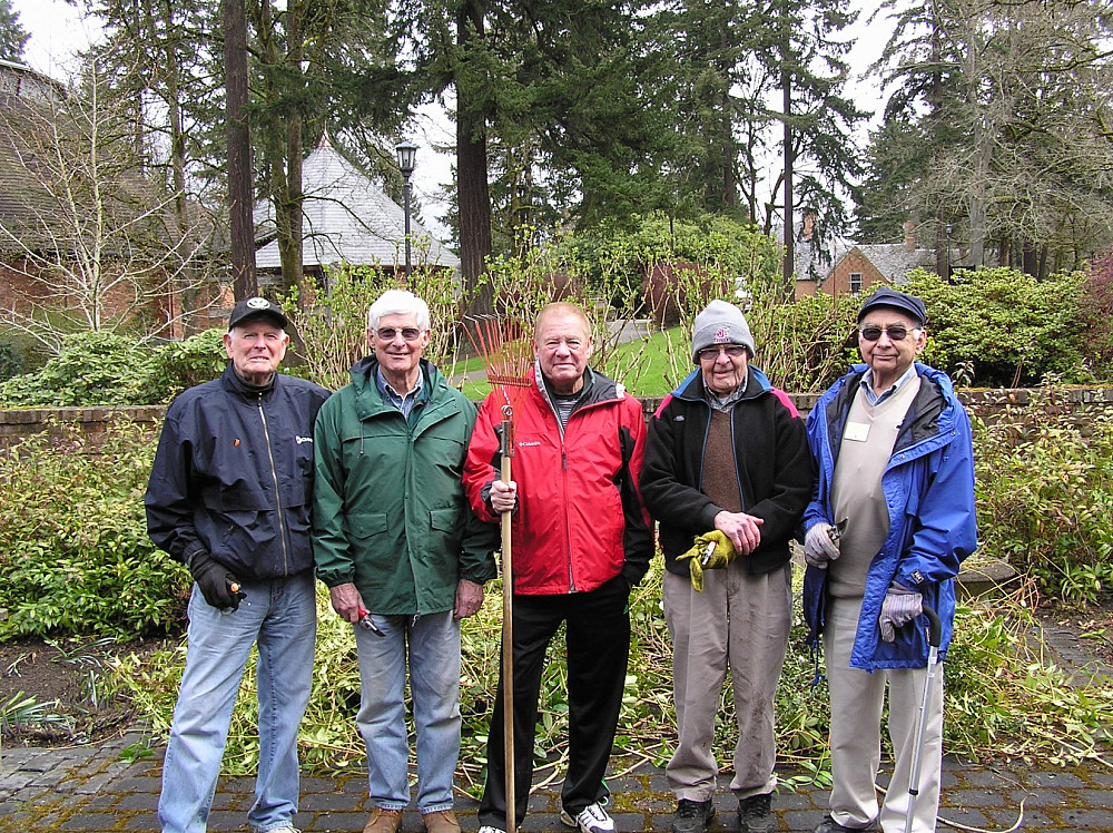 The Albany Society has a long history of service to Lewis & Clark. On a rainy day in April 2011, Don Hoyt ’50, Bill Mangels ’55, Jim Stell ’60, Curt Copenhagen ’55, and Jim Cole ’54 volunteered their gardening expertise for a grounds improvement project at the Morgan S. Odell Alumni Gatehouse. The result of their pruning, shearing, and digging can be seen and appreciated at the Gatehouse patio to this day.